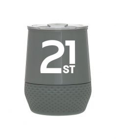 12 oz double wall 18/8 stainless steel thermal tumbler with copper vacuum insulation, push-on lid, matching swivel closure, and removable silicone base.