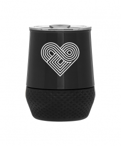 12 oz double wall 18/8 stainless steel thermal tumbler with copper vacuum insulation, push-on lid, matching swivel closure, and removable silicone base.
