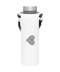 32 oz double wall 18/8 stainless steel thermal bottle with copper vacuum insulation, insulated stainless steel threaded lid, silicone ring, removable strap with buckles, removable clasps, and powder coated finish. Individual gift box. Hand wash recommended. Do not microwave. Complies with FDA, Prop 65. 11" H x 3.1875" W