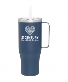 40 oz double wall 18/8 stainless steel thermal mug with copper vacuum insulation, stainless steel rim, dual-purpose push-on clear lid, matching sliding closure, flexible wide silicone straw, and powder coated finish. Individual gift box. Hand wash recommended. Do not microwave. Complies with FDA, Prop 65. 9.75" H x 4" W