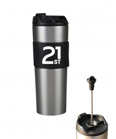 - Stainless steel tumbler for on-the-go coffee brewing.